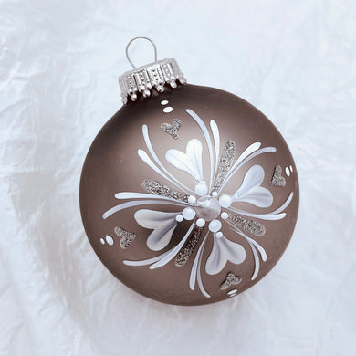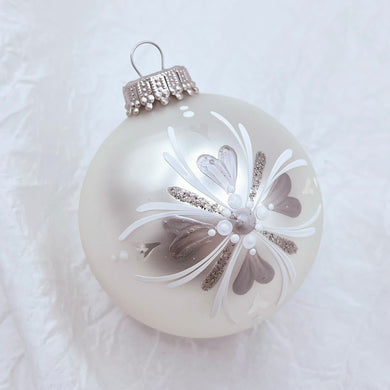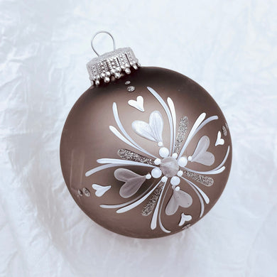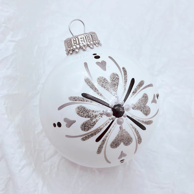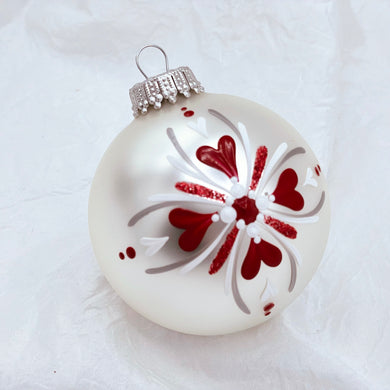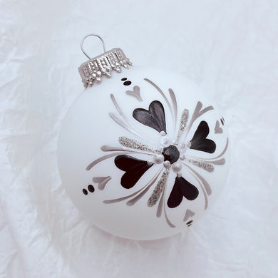 Ég hanna nýtt munstur á hverju ári og handmála á hágæða jólakúlur úr gleri. Hver árgangur er í takmörkuðu upplagi þar sem hver kúla er einstök, því engar tvær eru með sömu litasamsetningunni. Ást er 10. munstrið í þessari seríu. Öll einkennast þau af hringmunstrum innblásnum úr íslenskum hannyrðum. Hver kúla er undirritaðuð af listamanninum með ártali og pökkuð í vandaðan kassa.