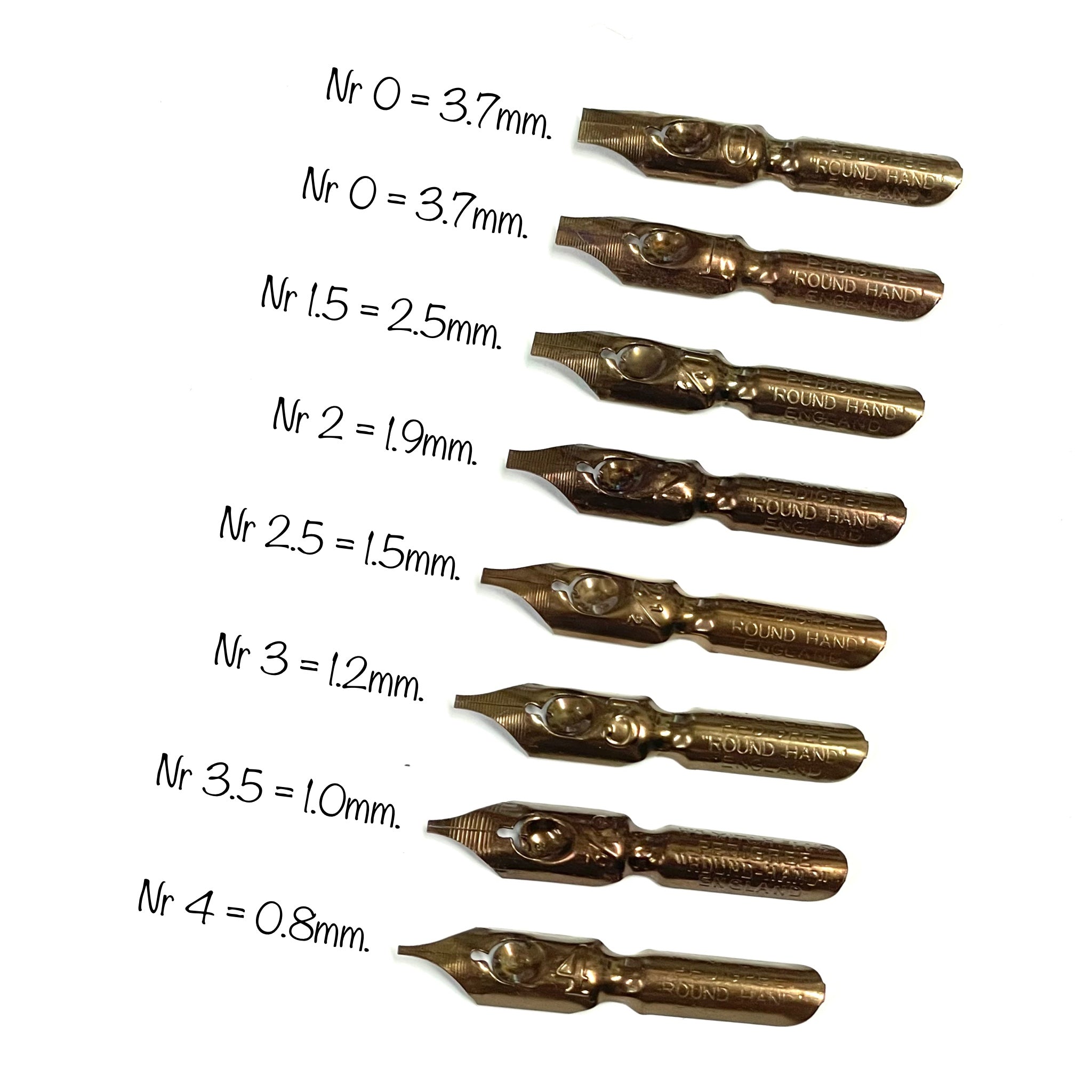 Skrifoddarnir eru fáanlegir í 10 stærðum: 0, 1, 1½, 2, 2½, 3, 3½, 4, 5 og 6